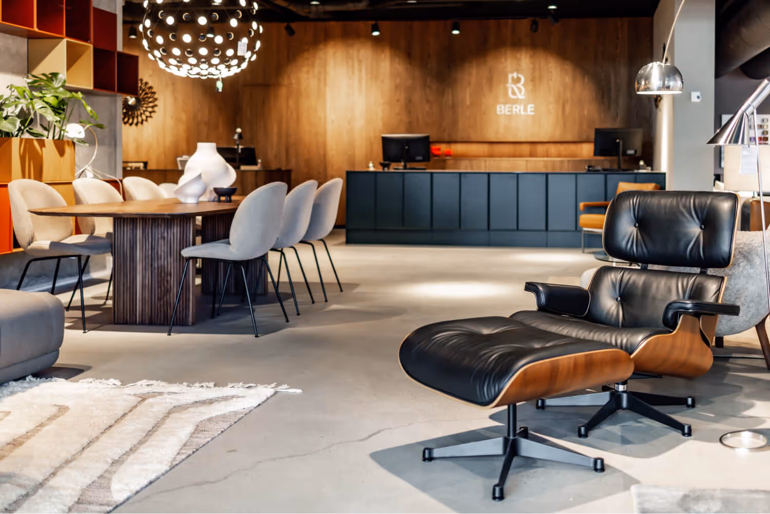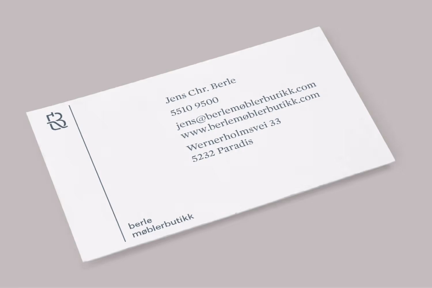These images show the redesign of the current identity of Berle Bergen Møbler & Interiør, a high-end furniture store in Bergen, Norway.